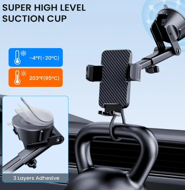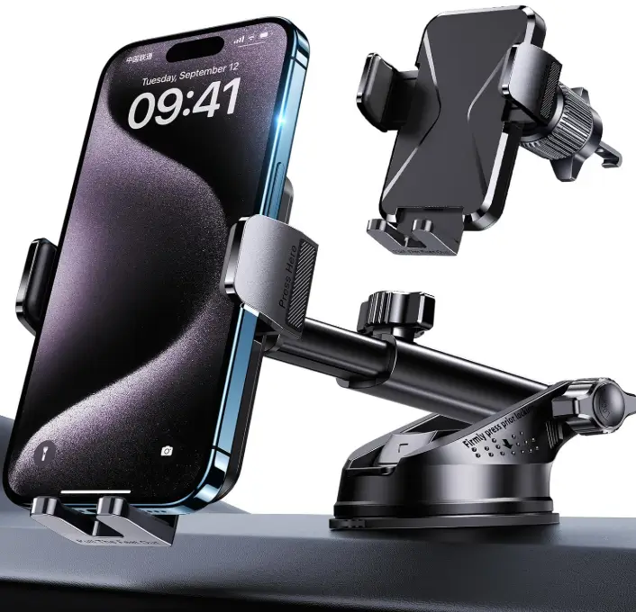 This phone car holder features a military-grade suction base that delivers exceptional grip and stability on the dashboard or windshield, even on rough roads. The 3-in-1 design allows flexible mounting on the dashboard, windshield, or air vent, making it easy to position your phone exactly where you need it for safe navigation and hands-free use. Compatible with both iPhone and Android devices, it offers quick one-hand operation and a secure hold for everyday driving convenience