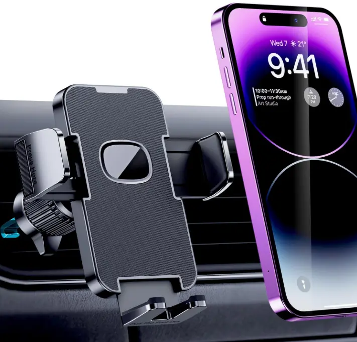 This upgraded air vent car phone holder features a secure clip design that locks firmly in place, preventing slips or falls even on bumpy roads. It provides a stable, hands-free viewing experience for both iPhone and Android smartphones, making navigation and calls safer while driving. Easy to install and remove with one hand, it offers reliable everyday convenience without blocking your view
